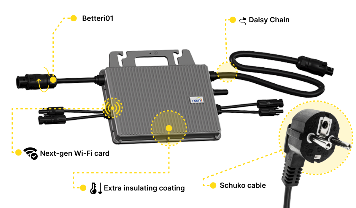 • 3× TSUN MS800-Daisy Chain microinverters with next-gen WiFi card and real-time monitoring
